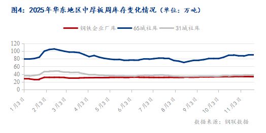 我们可以从图4看到,华东区域的社库低点出现在年中,而从调研情况来看,江苏区域的锅炉容器板库存低点也是出现在了年中,全年的库存走势和华东的中厚板库存走势非常相似。