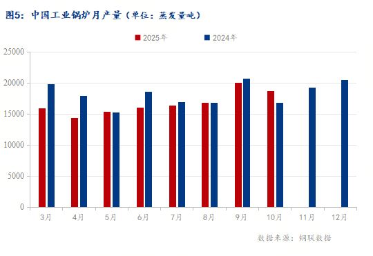 工业锅炉是锅炉容器板的一个重要应用领域,主要用于制造锅炉的锅筒、集箱、过热器等承压部件。从国家统计局公布的数据来看,今年的工业锅炉产量一直处于同比下降的趋势,我们可以从图5来看一下具体的数据,今年单月的产量同比去年同期,基本处于下降的趋势,仅仅到了第四季度的开端,月产量才高于去年同期。