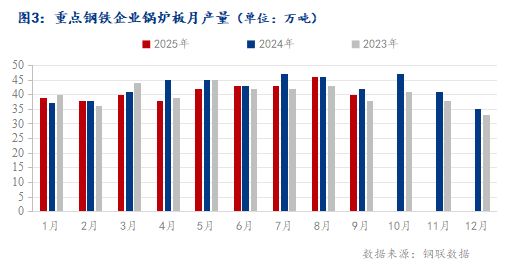 笔者在11月去了江苏调研,经过整理,我们来看一下在江苏区域投放资源的一些主要钢厂:南钢、新钢、鄂钢、沙钢、首钢、马钢、唐钢、沙钢、六安钢铁等,月投放量多的有一万多吨,少的在一两千吨。而于此同时,从北方流入江苏市场的资源基本上以直接订单为主,流通方式多为终端及配送商从北方的钢厂或者贸易商采购。作为全国锅炉容器板最重要的市场,江苏的丰富资源让本地市场一直处于完全竞争的状态。从图3我们可以看到,2025年的锅炉容器板相比2024年,其产量是下降的。